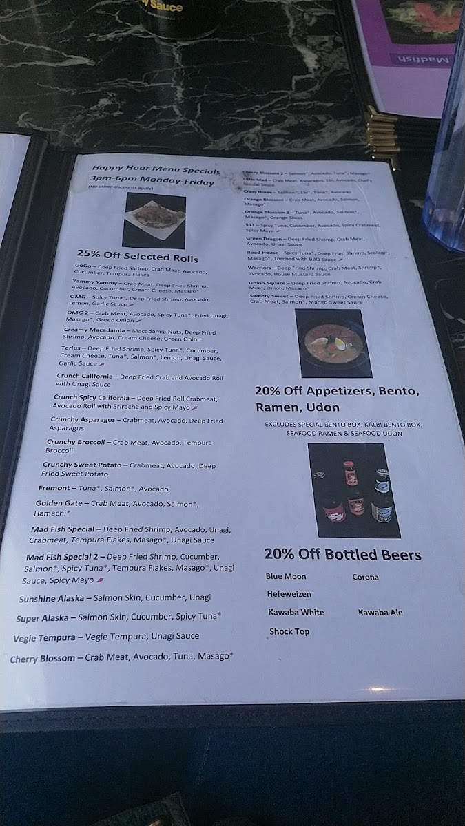 Located in the heart of Fremont, Little Madfish offers a captivating menu that blends tradition with innovation. Highlights include the all-day special, Simba Crabmeat, featuring succulent crab, salmon, and masago, baked to perfection for just $6.95. Sushi enthusiasts will relish the Fireworks Spicy Tuna roll, bursting with flavor from jalapeño and spicy mayo at $15.75.